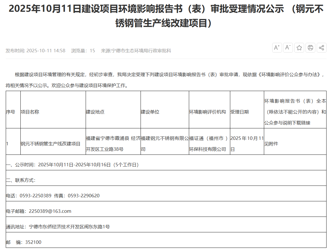 2025年10月11日,寧德市生態(tài)環(huán)境局受理福建鋼元不銹鋼有限公司鋼元不銹鋼管生產(chǎn)線改建項(xiàng)目環(huán)境影響評(píng)價(jià)報(bào)告表并對(duì)外進(jìn)行公示,公示時(shí)間:2025年10月11日-2025年10月16日(5個(gè)工作日)。